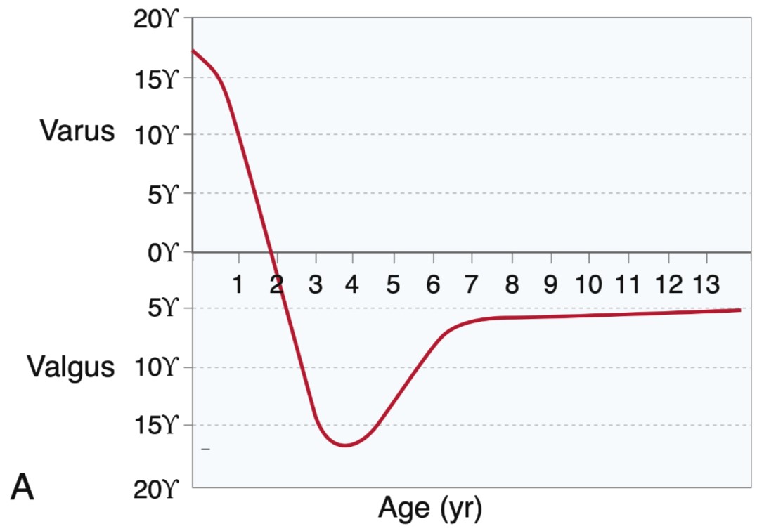 - หลังจากอายุ 3 ปี ขาจะค่อยๆโก่งน้อยลงอีกครั้ง จนกลับมาสู่แนวขาปกติ คือ แนวขาตรง หรือ ขาโก่งเข้าในเล็กน้อย ประมาณ 6-7 องศา ที่อายุประมาณ 7 ปี