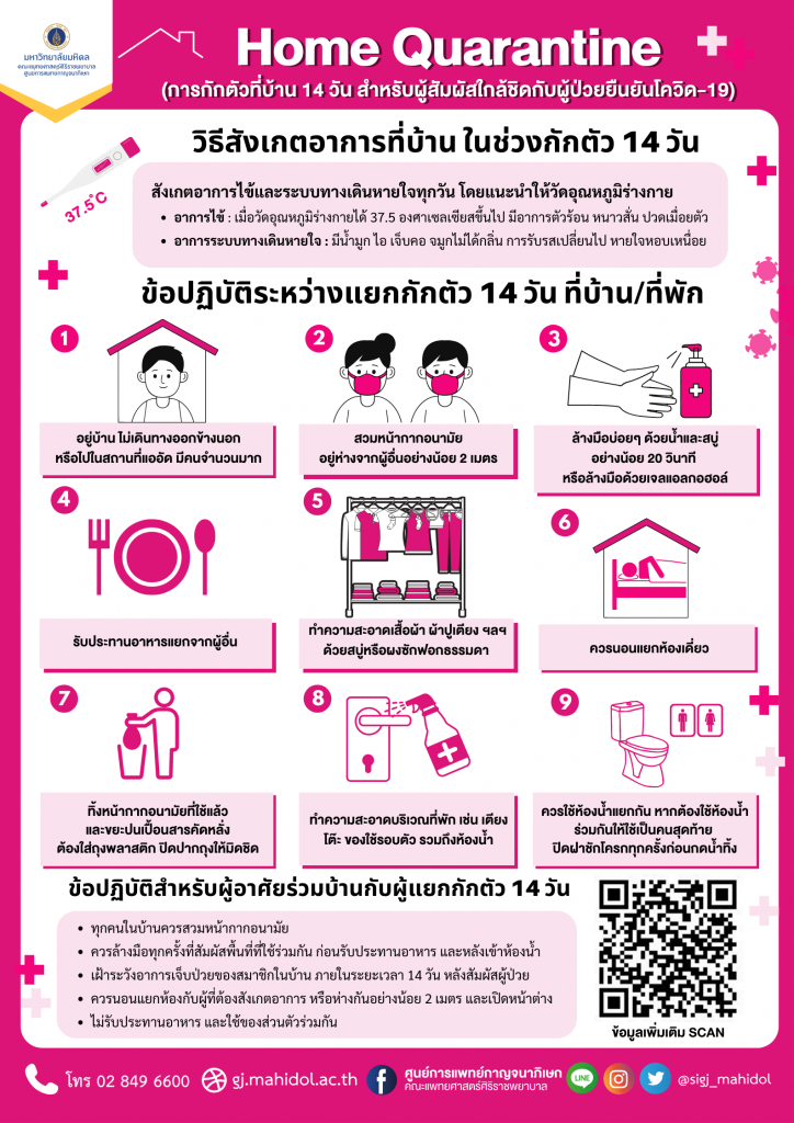 คำแนะนำการปฏิบัติระหว่างการแยกกักตัว 14 วัน เพื่อสังเกตอาการที่บ้าน (Home Quarantine) สำหรับผู้สัมผัสใกล้ชิดกับผู้ป่วยยืนยัน โควิด-19