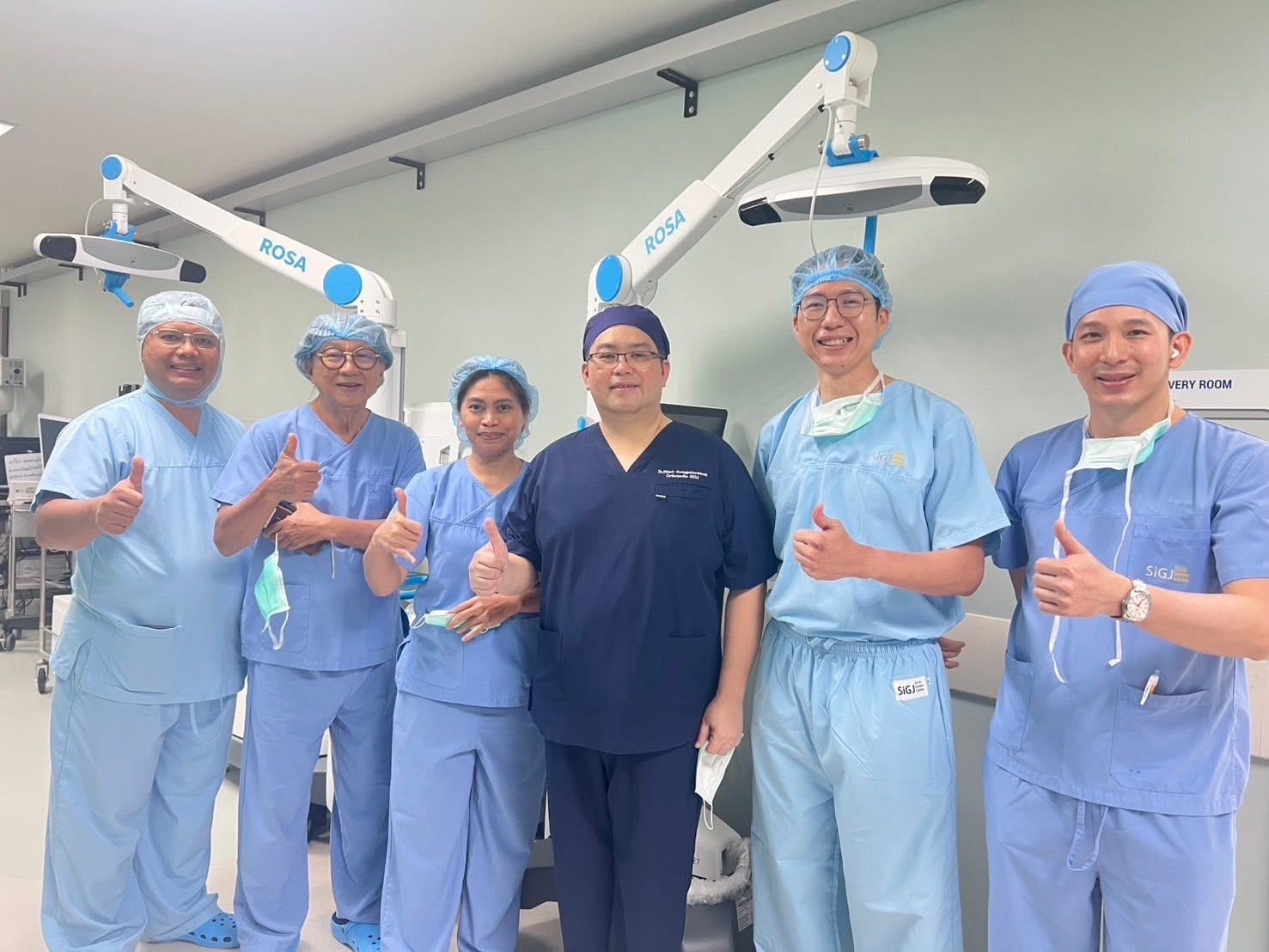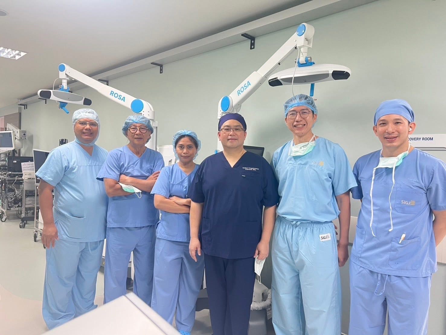 Associate Professor Teera Kolladarungkri, the director of Golden Jubilee Medical Center, Dr. Nimit Thongpulsawasdi, the vice director of Golden Jubilee Medical Center, Dr. Tawan Intiyanaravut, the vice director of Golden Jubilee Medical Center, Dr. Payap Payapanon, orthopedic surgeon, and Robot TKA@SIGJ Team welcomed Dr. Fanky Hartono, orthopedic surgeon from Siloam Kebon Jeruk Hospital, Indonesia, Dr. Karina E.M. Besinga, orthopedic surgeon from Universitas Kristen Indonesia, Indonesia, and Dr. Daniel Petrus Marpaung orthopedic surgeon Pantai Indah Kapuk Hospital, Indonesia for knowledge exchanging and observing Robotic Assisted Total Knee Arthoplastry performed by Orthopedics of Golden Jubilee Medical Center on 6 – 7 October 2025 at Golden Jubilee Medical Center.