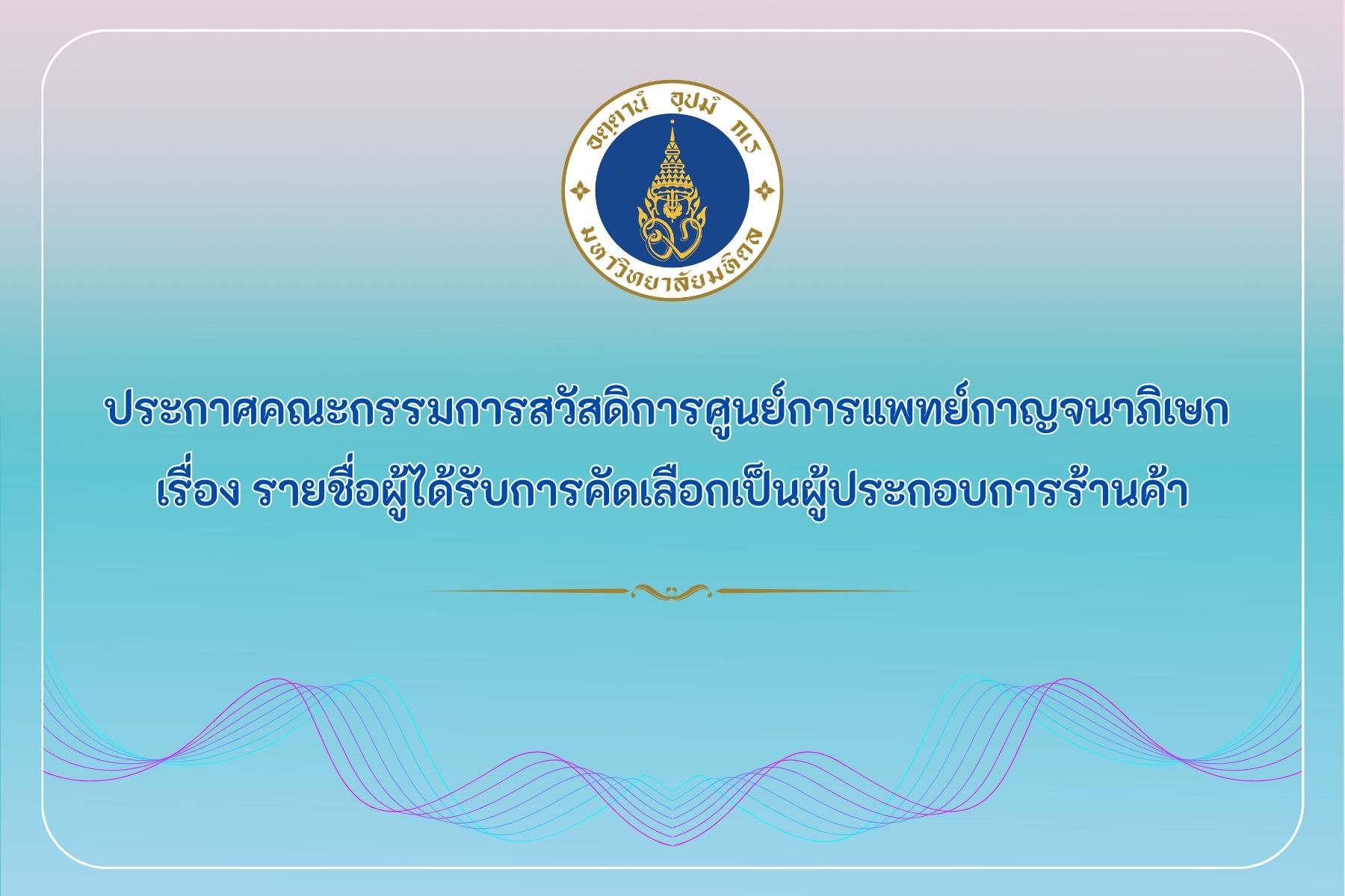 ประาศคณะกรรมการสวัสดิการศูนย์การแพทย์กาญจนาภิเษก คณะแพทยศาสตรืศิริราชพยาบาล เรื่อง รายชื่อผู้ได้รับการคัดเลือกเป็นผู้ประกอบการร้านค้า ณ ศูนย์การแพทย์กาญจนาภิเษก