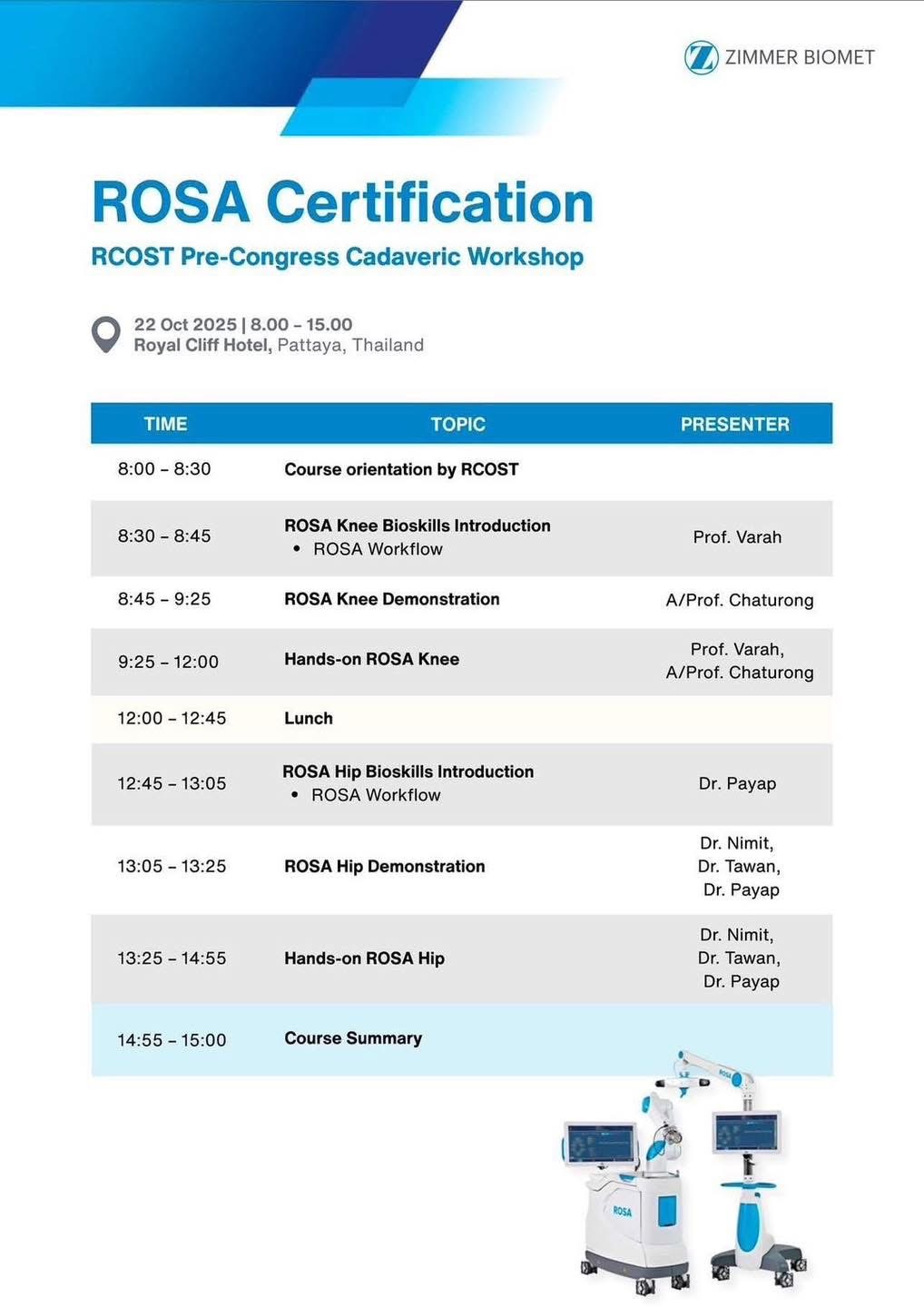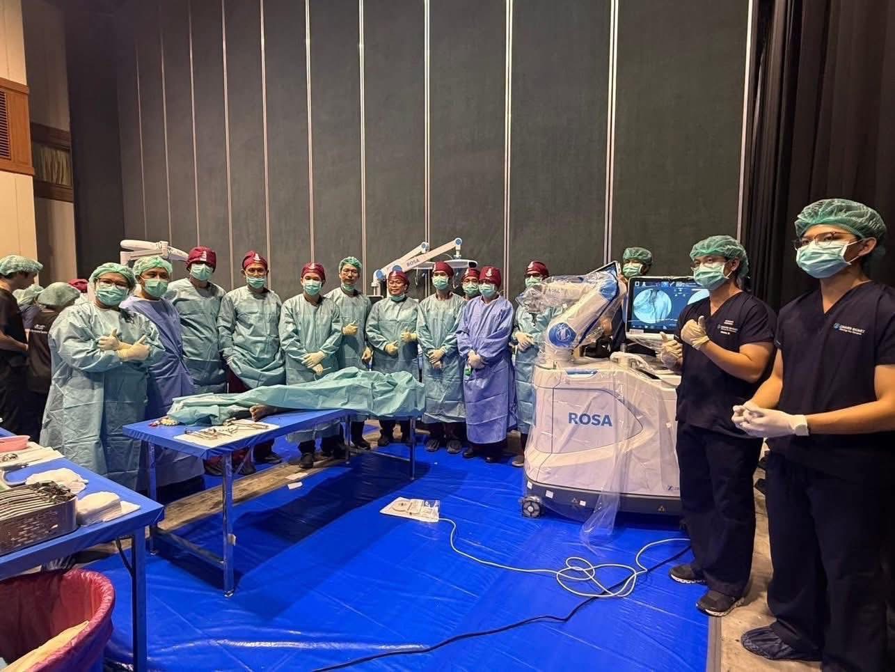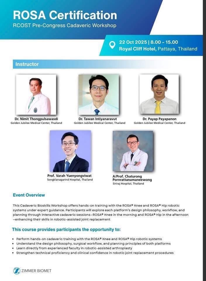 นพ.นิมิตร ทองพูลสวัสดิ์ รองผู้อำนวยการศูนย์การแพทย์กาญจนาภิเษก นพ.ตะวัน อินทิยนราวุธ รองผู้อำนวยการศูนย์การแพทย์กาญจนาภิเษก และ นพ.พยัพ พยัพพานนท์ ศัลยแพทย์กระดูกและข้อ เข้าร่วมงานประชุมวิชาการ The 47th Annual Meeting of the Royal College of Orthopedic Surgeons of Thailand (RCOST 2025) โดยเป็นวิทยากรในการ Workshop : RCOST Pre-Congress Cadaveric Workshop สาธิตการใช้หุ่นยนต์ช่วยผ่าตัด ROSA ผ่าตัดเปลี่ยนข้อสะโพก และข้อเข่า ในวันที่ 22 ตุลาคม 2568