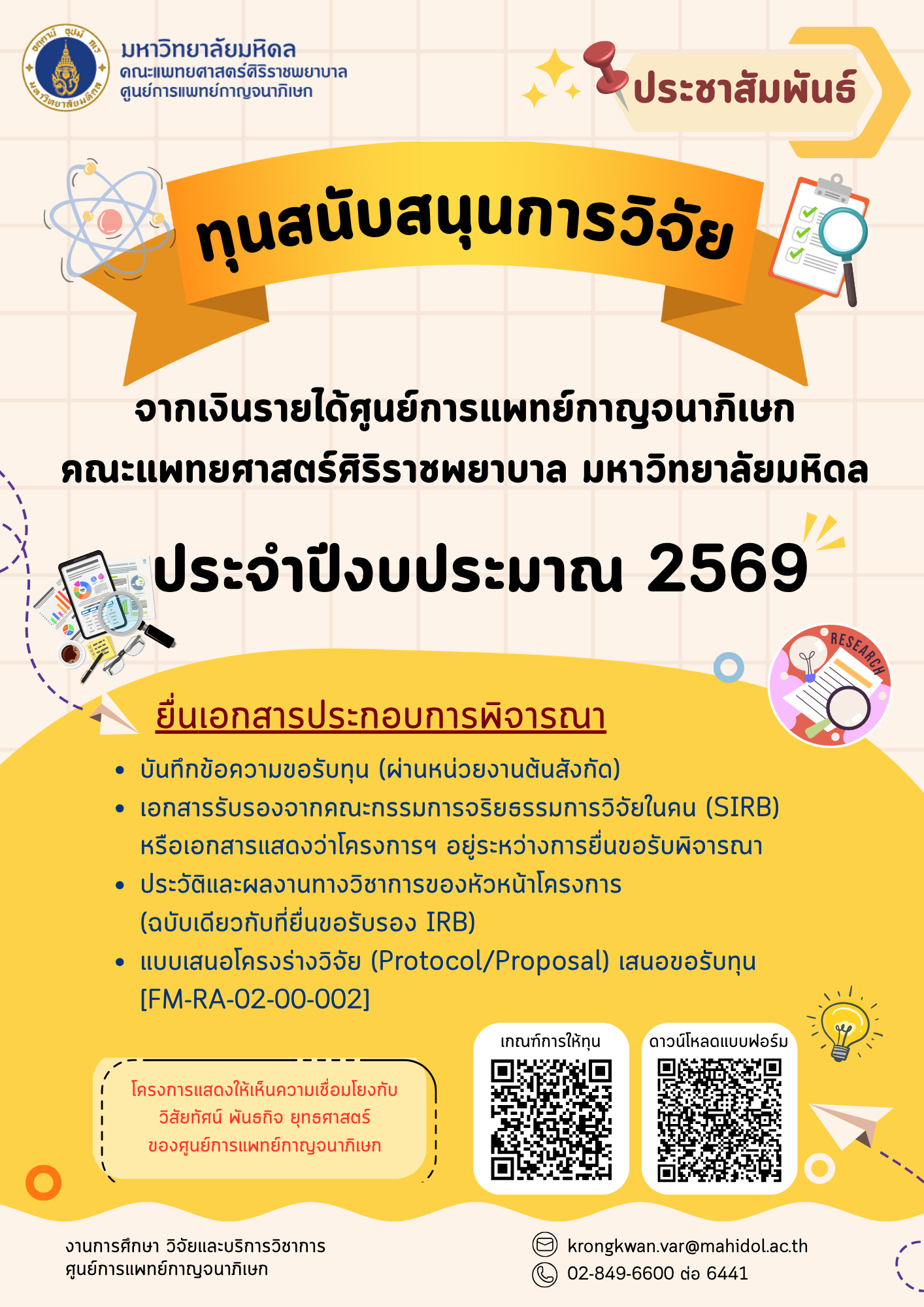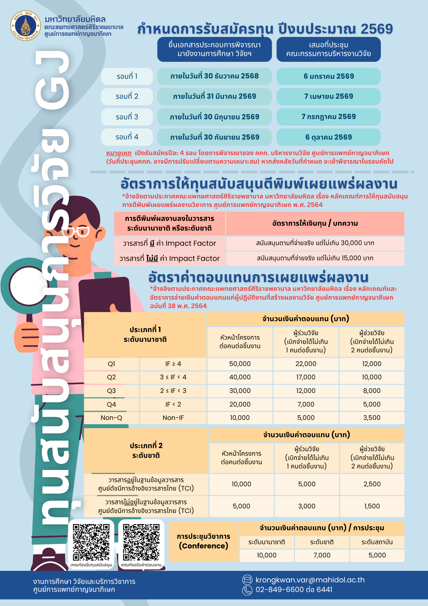 RESEARCH INFOGRAPHIC ประกาศ/ ระเบียบ/ ข้อบังคับ ประกาศมหาวิทยาลัยมหิดล เรื่อง ห้ามใช้สิทธิิการเบิกค่ารักษาพยาบาลของผู้ร่วมวิจัยฯ โครงการวิจัยที่ไม่เข้าข่ายการวิจัยในคน ทุนสนับสนุนการวิจัย เปิดรับข้อเสนอโครงการวิจัยเพื่อขอรับทุนสนับสนุนการวิจัยปีงบประมาณ 2569 การยื่นขอรับค่าสนับสนุนตีพิมพ์เผยแพร่ผลงานวิจัยและการรับค่าตอบแทนตีพิมพ์ อัตราการให้ทุนสนับสนุนตีพิมพ์เผยแพร่ผลงานวิจัยและค่าตอบแทนตีพิมพ์ จริยธรรมการวิจัย การประพฤติผิดจรรยาวิชาชีพวิจัย การยื่นขอรับรอง IRB กรณีพหุสถาบันสำหรับบุคลากรศูนย์การแพทย์กาญจนาภิเษก หลักสูตรอบรมจริยธรรมการวิจัยในคนCITI PROGRAM (SELF STUDY) การอบรมจริยธรรมการวิจัยในคน Online ขั้นตอนการยื่นเอกสารสำหรับผู้วิจัย การขอรับความคุ้มครองด้านทรัพย์สินทางปัญญา งานวิจัยต้องรู้ มาตรวัดตัวแปร มีกี่ประเภท ? เมื่อไหร่ ? .... ควรใช้สูตรทาโร่ยามาเน่ ในการคำนวณขนาดตัวอย่าง Checklist ก่อนส่งบทความวิจัยตีพิมพ์ R2R คืออะไร ? ทำ R2R แล้วได้อะไร ? LEARNING ORGANIZATION